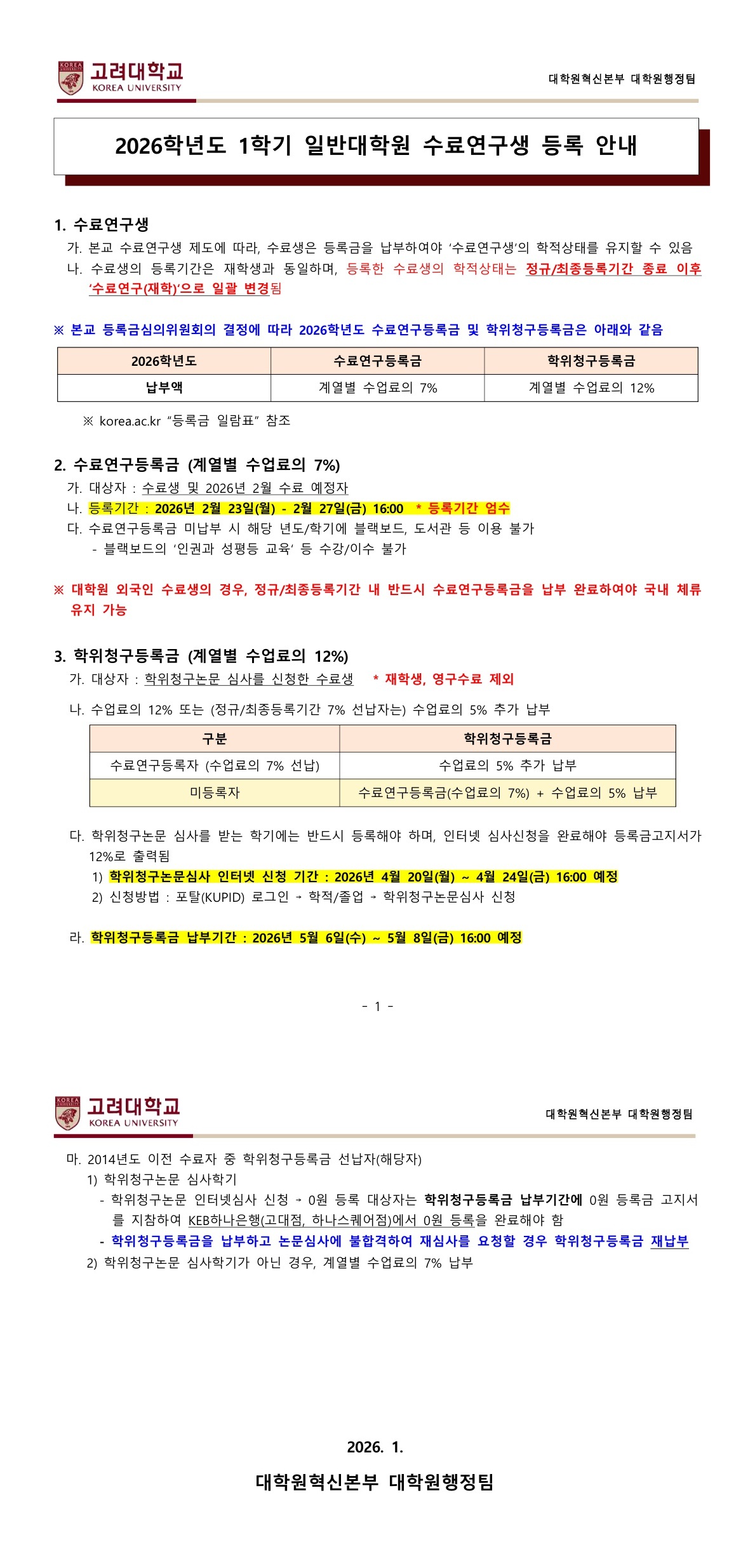 | 제목 | 2026학년도 1학기 수료연구생 등록 안내 |