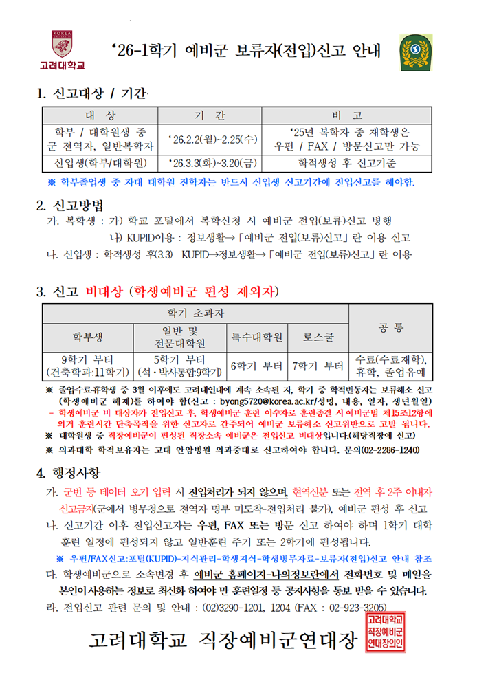 제목 26-1학기 학생예비군 보류자(전입) 신고 안내