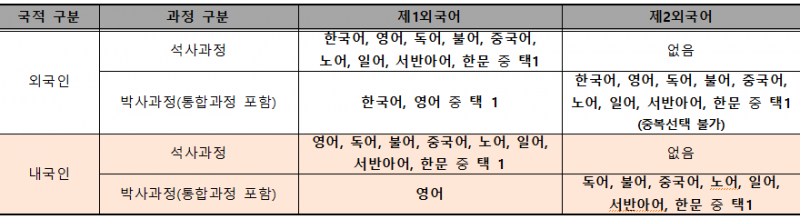 ※ 내국인(대한민국 국적) 박사과정은 영어만 신청 혹은 아래 해당학과는 제2외국어도 충족해야함